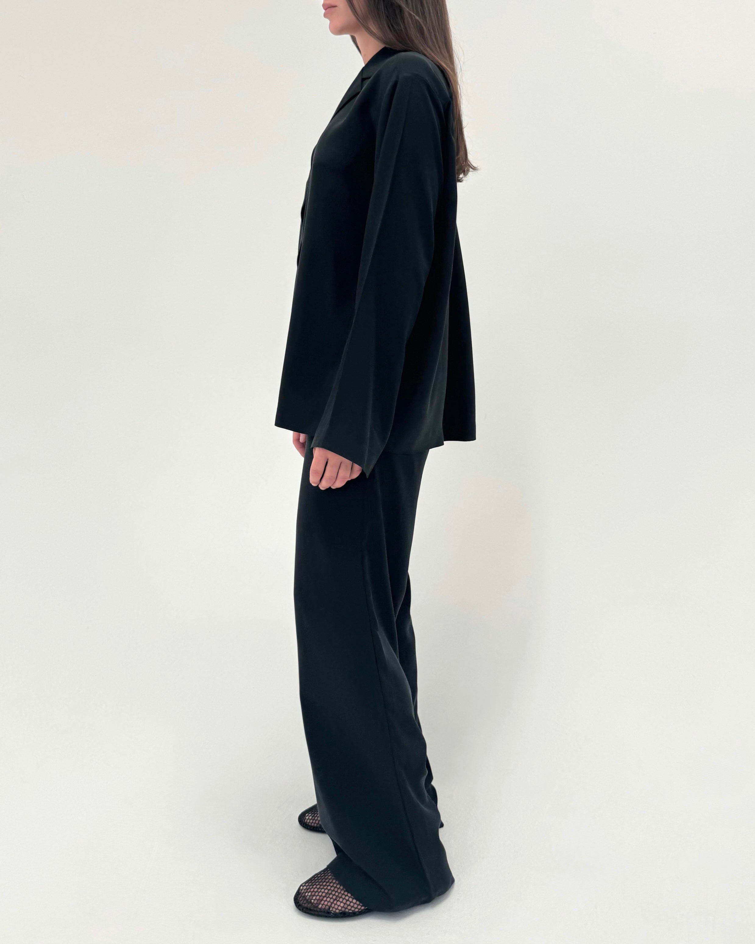 Our 'Oversized Shirt' is crafted from a lightweight, eco-conscious fabric - 100% TENCEL® Lyocell - in timeless black color. Featuring a concealed button front with tone-in-tone corozo nut buttons, this shirt exudes understated sophistication. Its relaxed silhouette, accentuated by dropped shoulders and slightly flared sleeves with pressed creases, offers a modern twist on timeless design and the pleat on the back allows for an oversized fit that drapes beautifully. This wardrobe essential transcends seasons and occasions with ease. Whether you're traveling to distant destinations or enjoying a leisurely stroll in your city, it's a versatile piece that effortlessly adapts to every trip, every mood, and transitions seamlessly from day to night, from work to play.